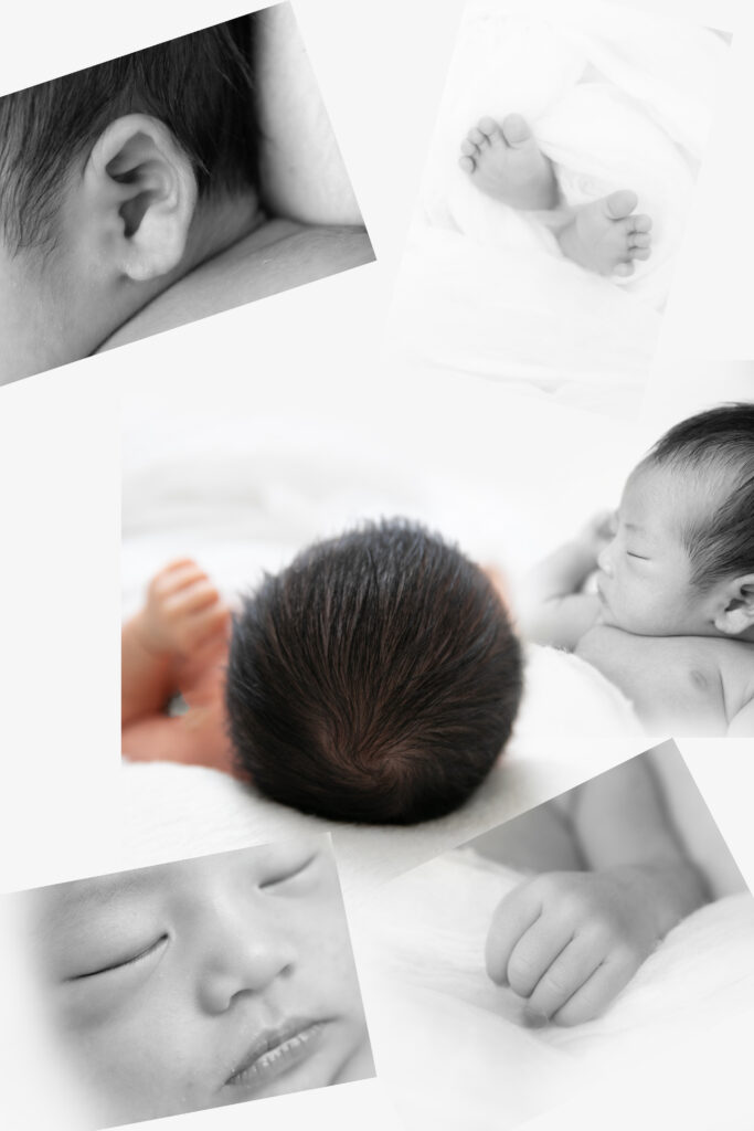 白黒やセピア調のコラージュでも映えるパーツ写真は、パパママに大人気! 小さな耳の形、くるんとしたつむじ、そして今にも動き出しそうな足の指先…。 1ヶ月後にはもう変わってしまう「新生児だけのカタチ」を、高画質なプロの技術で残します。 「こんなに小さかったんだね」って、あとで家族で振り返る時間が一番幸せだったりしますよね🥹💕