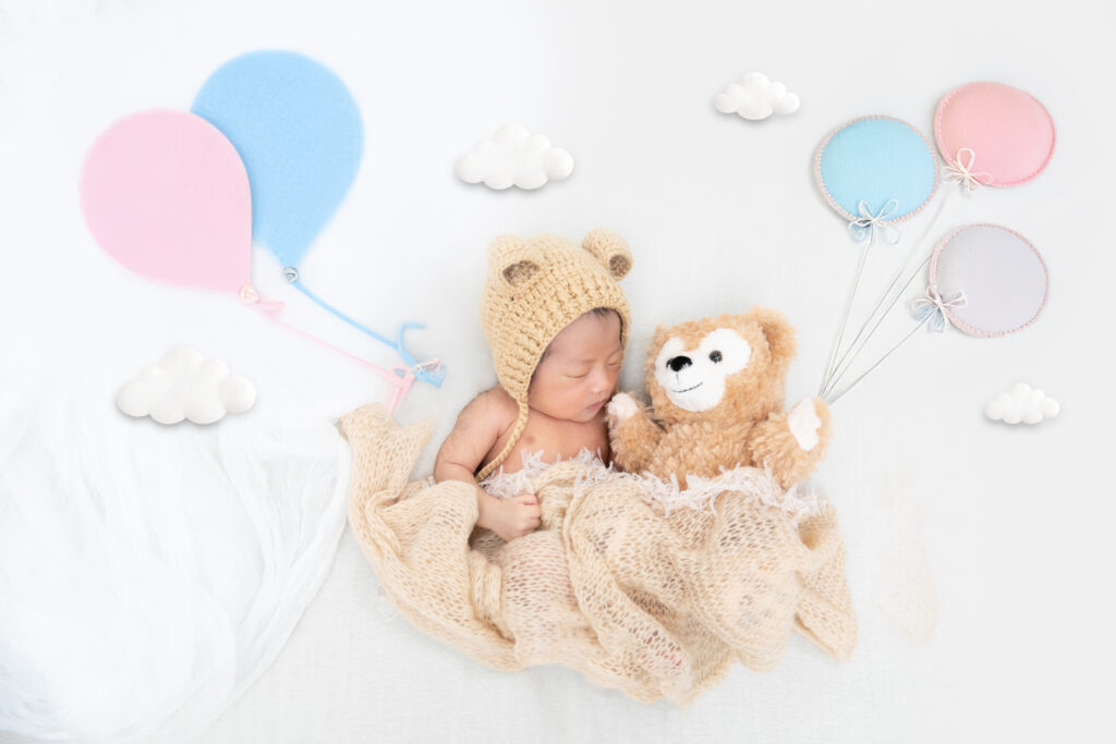 ベージュのクマ耳帽子をかぶった赤ちゃんが、大好きなダッフィーのぬいぐるみと寄り添って眠る姿…。 そこに、パステルカラーの風船やふわふわの雲をあしらって、「まるで風船で空を飛んでいるような世界観」を作り上げました!🎈☁️ これにはパパもママも「可愛すぎる〜!!」と大絶叫(笑)! こうしたオリジナリティあふれるショットも、出張撮影ならではの楽しみですよね🌈✨