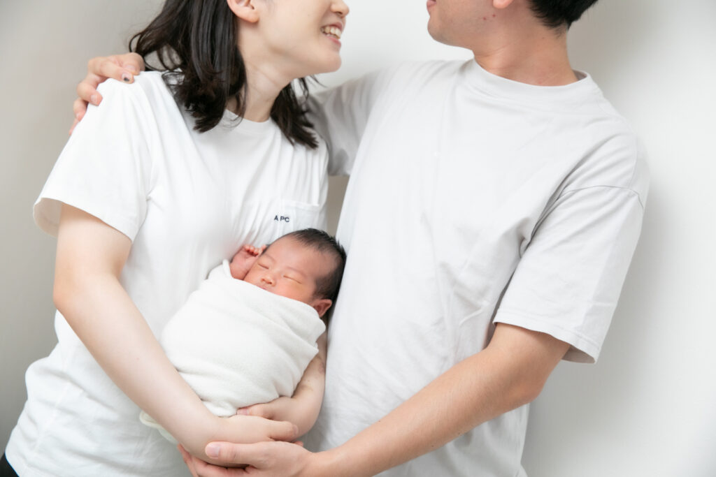 ママとパパが白いTシャツで揃えてくださった家族写真は、清潔感があってとっても素敵でした! 幸せそうな笑顔のお二人に抱っこされて、赤ちゃんも安心した表情を見せてくれましたよ😊💖